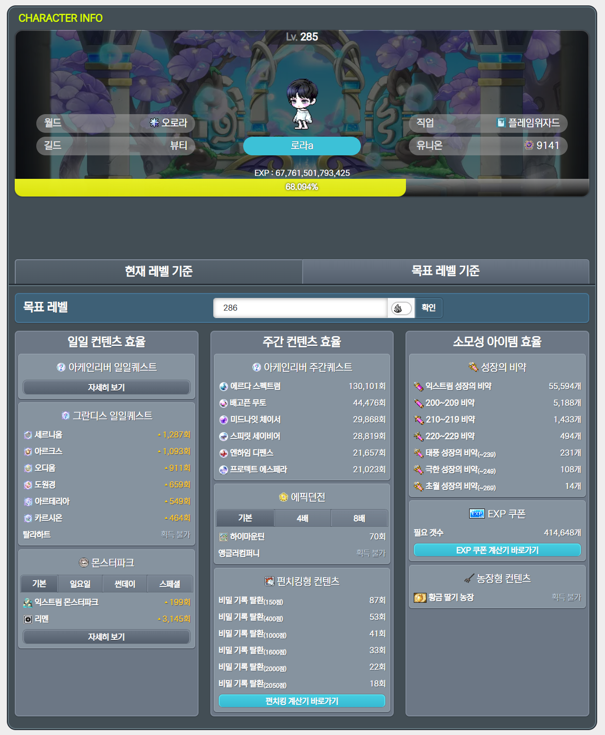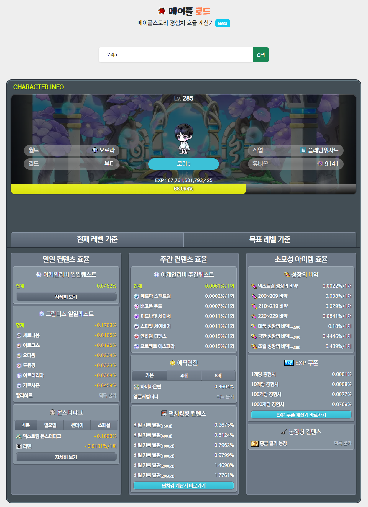 새로 오픈 한 메이플로드 경험치 효율 계산기를 소개드립니다.